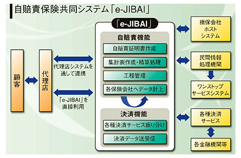 自賠責保険は公共性が高く、事務手続きなども法律で決められた非競争分野の商品だけに、顧客への自賠責証明書の発行処理を除けばIT化投資のインセンティブが働きにくかった。しかし、OSSが導入されれば「民間情報処理機関」に自賠責証明データの提供が必要になる。損保各社が個別にシステム対応するよりも共同でシステムを構築して、契約から自賠責証明書の発行、保険料精算の集計・決済、契約内容のデータ送信まで自賠責保険の事務処理全体で、遅れていたIT化を一気に進めることになった。決済機能には、ペイジー決済サービスを利用、自賠責証明書の用紙も各社共通で標準化、e-JIBAIを利用すれば乗合代理店が1台の端末で複数の損保会社の事務処理を行うことも可能だ。