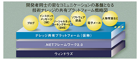 ネットワークの構築に当たっては、.NETフレームワーク2.0上にナレッジ共有プラットフォームを乗せる形にする。自ら率先して.NETフレームワーク2.0を採用することで、開発実績を積む考えだ。顧客企業は.NETフレームワーク2.0での開発実績の有無を重視するため、まずは社内システムで実績を積み、これをモデルケースとして顧客企業に公表することも検討している。