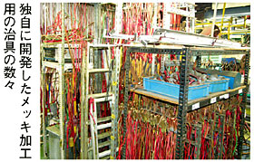 看板商品のダイクロンは1970年に開発。以来綿々と改良を続けて主力商品に育て上げた。硬くて摩耗しにくい硬質クロムメッキよりも「さらに硬いメッキ」として業界での知名度は高い。複雑な形状をした素材にも、独自につくった治具でメッキを施していく。