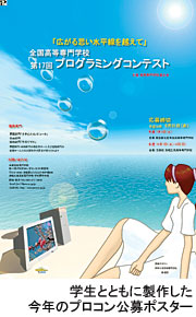 今年の主管校である茨城高専は、まず手始めに全国の高専学生に参加を呼びかけるポスターを制作し、着々と準備を進めている。図柄やキャッチコピーは自校の学生とともに考えた。ポスターに採用されたキャッチコピーは、「広がる思い水平線を越えて」。太平洋に面した美しい国営ひたち海浜公園に隣接した同校の立地環境をよく表している。プロコン担当の森龍男副校長学生主事は、「われわれの年代なら茨城のイメージとして水戸黄門や納豆が多いが、学生たちは太平洋に思いを馳せた」という。海を越えてプロコンの認知度が高まれば、国境を越えて参加する学生も増える。このキャッチには、学生たちのそうした意気込みが込められている。
