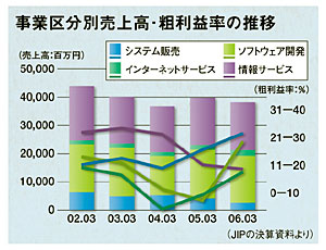 日本電子計算(JIP、内池正名社長)は不採算案件を半減させ、昨年度(2006年3月期)に黒字転換を果たした。05年6月に就任した内池社長が矢継ぎ早に打った施策が出血(赤字)を止める成果となって現れてきた。とはいうものの、本来計画していた目標と比べれば差異は大きいと言わざるを得ない。