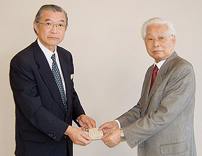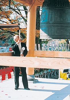 益子町長に基金贈呈 また、先祖代々の墓がある菩提寺に梵鐘と鐘楼堂を寄進し、平成16年(2004年)11月28日、稚児行列に続いて盛大な落慶法要が行われました。初めて聞く梵鐘の響きは低音の美しい音色で、心が洗われる思いがしました。
