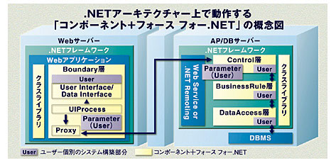 こうしたリスクを軽減するために、.NETフレームワーク上に独自の開発フレームワーク「コンポーネント+フォースフォー.NET」を搭載。ソースコードの規則化を進め、手作業で作り込んでいくプログラムの量を減らす取り組みを進めている。開発フレームワークによってアプリケーションを動作させるコンポーネントの基礎部分をカバーし、顧客の要望に合わせて開発する部分に開発資源を集中させることで、生産性や品質を高めようとするものだ。