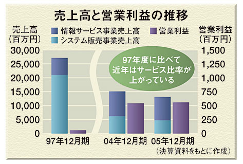 10年前はハードウェアなど製品販売が売上高の中心を占めており、90年代、急速に進んだハードウェアの低価格化の煽りを直接的に受けたことが業績悪化に拍車をかけた。