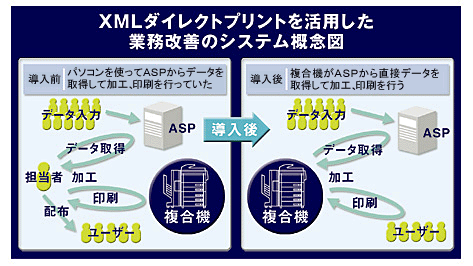 業務アプリケーションで扱うデータを印刷するときは、これまでパソコンを使って一度データを呼び出して加工。帳票などに形式を整えてからプリンタで印刷する必要があった。印刷した書類を担当者に配布する手間もかかる。ダイレクトプリントを使えばパソコンを介さず直接的に必要なデータを印刷できる。担当者自らがデジタル複合機から必要な書類を指定して取り出せるため配布する必要もない。