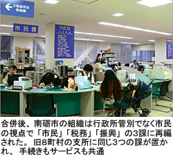 その結果、住民は旧8町村のどの支所でも同一の手続きが行え、同一の行政サービスを受けることができる。当り前のことのようだが、実際にはなかなか難しい。合併によって手続きの手順が変わり、サービスの水準が低下したケースが少なくない。さらにその旧行政区の事情に対応できない、といったマイナス面が指摘されている。