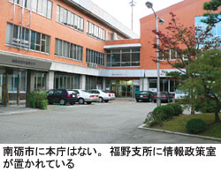 「どうして本庁を持たないのか、と尋ねられても、ちょっと…」と苦笑するのは、南砺市企画総務部の大浦章一室長。「合併協議を通じて8つの町村が折り合った結果」という。また情報システムの企画・設計を担当する市川孝弘係長は、「自前のセンターシステムを持っていないからといって、少しも不都合はありません」と断言する。