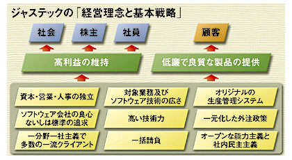 同社の「経営理念」のひとつに、「マンパワーリースを排除したソフト開発」に専念することがうたわれている。「派遣ビジネスを志向せず、一括元請けに徹する」(柴山泰生・常務取締役兼常務執行役員総務経理部長)と、リスクは比較的小さく利益率が低い常駐型派遣や、「人月単価」で稼ぐ経営手法を“否”としている。