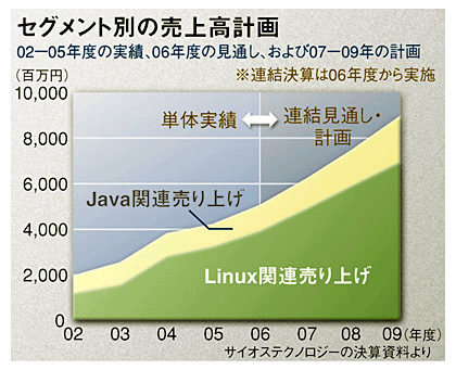 サイオステクノロジーは、米ソフト開発ベンダーの買収関連費用の償却や人員増などのコストが膨らみ、今年度(2006年12月期)から来年度にかけて2期連続の赤字を見込む。黒字転換は08年度になる見通しで、昨年度の経常利益率6.3%を超える水準になるのは09年度以降だと予測している。一時的に赤字を出してでも狙うものとは何か。主力のLinuxのサービスサポートビジネスは売上高の8割近くを占める。国内トップクラスのシェアを持ち、これまでの成長を支えてきた優良事業である。しかしこの分野の国内市場規模は05年が約100億円、2年後の08年は約200億円と推計され、仮に08年度に国内で半分のシェアを獲ったとしても同事業の売上高は100億円である。