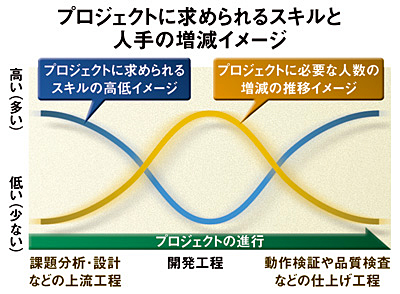 新野社長はプロジェクトに求められるスキルと人手の増減に着目。設計→開発→テストの一連の工程のなかで「設計」と「テスト」は高い水準のスキルが必要であるのに対して、「開発」は高いスキルよりも人手が多くかかる。上流の設計を誤るとプロジェクトそのものの不採算化を招く危険性も高まる。テストや動作検証は品質確保に欠かせない。