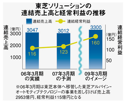 東芝ソリューション全体で06年度の連結売上高は06年4月に東芝本体へ移管した連結対象子会社東芝アルパイン・オートモティブテクノロジーの事業を差し引いた前年比で約2%増の3012億円、経常利益は同約7%増の123億円を見込む。2年後の09年3月期には連結売上高3300億円、経常利益160億円をイメージする。