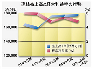 ただ、業界水準以上の経常利益率を達成しているとはいえ、ここ3-4年の利益率はほぼ横ばいで推移している。6%を超えたのは、02年度以来一度もない。今年度上期は、開発案件の不採算化が発生し営業利益は前年同期に比べて10億8000万円、経常利益は9億円減少した。90年代後半から02年までの成長率を考えれば、停滞感は否めない。