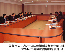 特に佐賀市が韓国企業にリプレースされた衝撃は大きかった。一時期、同社内では「佐賀市のことはタブー」とされ、取材に応じ難い空気が漂った。他地域にも波及することを怖れたNECは04年2月から6月にかけて、中国、中京地区の公共システム営業部門に引き締めをかけ、隠密裏にSDS社が構築したソウル市江南区のシステムを視察して研究したほどだった。
