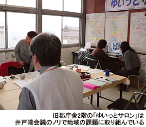 駅方向にちょっと戻ったところにある旧日詰郡庁舎の2階には、「ゆいっとサロン」がオープンしている。NPO法人えんのしたが運営、「井戸端会議のノリで地域の人と人を結びつけるお手伝い」(えんのした代表の中田芳子氏)が主な活動だ。