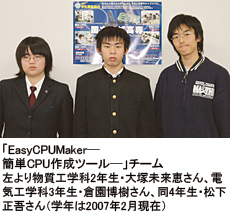 一方、自由部門がトライした「EasyCPUMaker─簡単CPU作成ツール─」は、PC上で動く「仮想CPU」を作成するツールだ。メンバーは、情報処理部に所属する電気工学科4年生の松下正吾さん、同3年生の倉園博樹さん、物質工学科2年生の大塚未来恵さん。作品は、これまで2年連続で競技部門に出場していた松下さんのアイデアだ。「CPUが好きで、以前から分かりやすく表現できたらいいなと考えた」そうだ。とはいえ、実際にどう表現していいのかと頭を悩ませたが、結果として、ほかにはない作品に仕上がった。