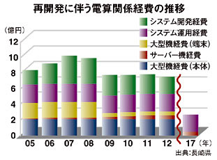 長崎県は2002年から本格的なダウンサイジング作業を開始。NEC製のメインフレーム2台を撤去してC/S型のオープンシステムへの移行を目指し計画をスタートさせた。計画前の02年に長崎県が抱えていたコストは9億9100万円。これを03年には1台のメインフレームを撤去して6億9400万円まで削減した。2017年には2億7100万円にまで抑制する計画だ。順調に進めば、他の都道府県ではみられないコスト削減が実現することになる。