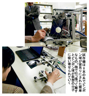 「HaptiChem(ハプティケム)」と名付けられた試作機は、コンピュータで処理された分子構造の引力・斥力(せきりょく=反発力)をピンポン球の動きに転写する。国立情報学研究所がこの3月に完成したものだ。