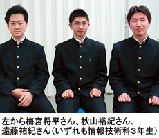昨年の高校生プロコンで、全国大会に駒を進めたのは、遠藤祐紀さん、秋山裕紀さん、梅宮将平さん(いずれも情報技術科3年生)の3人だ。ただし、梅宮さんは、エントリーしていたものの、同時期に行われたパソコン甲子園の本選出場が決まったため、高校生プロコンの全国大会には遠藤さんと秋山さんの2人で臨むこととなった。