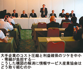 「たしかにそうすれば、大手は利益は確保できる。しかしそれでは業界の下支えが疲弊する。下支えが疲弊すれば、全体がこける」(日本システムディベロップメントの冲中一郎社長)。このことは「多重下請け構造の解消」というグランドデザインと正反対の方向性を示す。労働者派遣法、個人情報保護法、安全・信頼性基準、Pマーク、ITSS、ISMS、CMM…。「対応は任意」だが、それが多重下請け構造のなかで目に見えない“規制”となり、業界の疲弊を生んでいる。