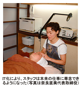 最近では、資本力のある大手エステサロンのチェーン店展開が激しさを増しており、「価格競争では勝てない」と認めている。ふじカプリスの強みは、奈良代表取締役やスタッフの技術力。エステティシャンは奈良代表取締役を含めて4人だが、「大手チェーン店には負けない腕前」と自負する。しかも、母の代から続いていることから、顧客のほとんどが親子二代にわたって来店してくれている。業界で生き残っていくためには、強みを把握して“攻めの経営”を行うことが重要。「顧客本位のサービス志向が他店に負けない大きな資産」との判断でIT化を図ったことになる。