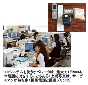 このシステムは、修理の依頼を電話で受け、オペレータが「修理依頼伝票」を起票すると、サービスマンの携帯電話に修理内容を配信。サービスマンは修理後、携帯電話で部品に添付された「QRコード」を読み込み、使った部品と価格の「領収書」を小型プリンタで印刷し、顧客に渡す。使用部品データ報告は、瞬時に本社システムに履歴管理され、在庫管理にも役立つという仕組みだ。