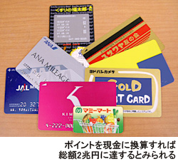 旅客航空会社のマイレージだけで4500億円超相当という推計もあって、総計はざっくり2兆円といったところではあるまいか。この金額は化粧品の市場規模とほぼ等しく、現在、世の中で動いている通貨の40分の1に匹敵する。