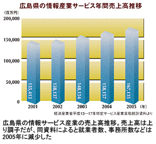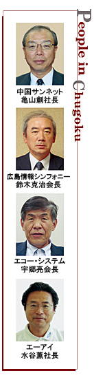 広島県のIT業界は、他の地域と同様、ゼネコン体質の下請け構造から抜け出せずにいる。マツダの企業城下町でもあるが、支店経済で、大口ユーザーはシステムを東京などの大手ベンダーに発注し、地場ベンダーは下請けに回ることも多い。地場では単金が安すぎるため、東京へ仕事を取りにいくのだという。「広島のユーザーは、名の知れた大手ベンダーに発注するブランド志向が強いし、保守的。こうしたなかで、大手ベンダーが手を出さないようなニッチなソフトを手がけている地場ベンダーが地場の直取りをすれば強い」と持論を展開するのは、エコー・システム(鹿毛秀之社長)の宇郷亮会長だ。