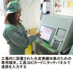 通常の構成は、工場内にパソコンやモバイル端末を配置し、工員に作業進捗を入力させ、既存の「総合支援システム」で自動集計するというものだ。しかし、「高齢者や外国人が多くてパソコン入力が難しく、それだけではなく、工場内のアルミ粉塵でパソコンが故障する可能性が高かった」(織田・IT担当)。