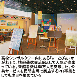 四国の支社や支店などが集まる香川県高松市。駅前には、香川県や高松市が中心となって取り組んだ再開発事業「サンポート高松」の中核施設「高松シンボルタワー」がそびえ立つ。国際化・情報化に対応した文化・コンベンション機能、情報発信交流機能、民間の業務・商業機能などさまざまな機能を備える同施設は、産官連携強化による情報化推進を促すことを同施設で実現している。 その柱になっているのが情報交流館「e-とぴあ・かがわ」である。この交流館は、香川県のPFI(プライベート・ファイナンス・イニシアティブ)事業として民間企業が運営している。運営企業は、かがわ県民情報サービス。凸版印刷やトータルメディア開発研究所、NTTドコモ四国、大成建設、デジタルハリウッド、アムロンの6社が共同出資した。