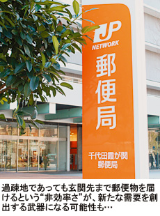 離島や山間部の過疎地にもハガキ1枚、封書1通を定額で届けるユニバーサルサービスは、現状では先行きが暗い。しかし団塊世代が一斉にビジネスの第一線から退く2010年以後、「ラスト・ワンマイルを握っていることは、反対に決定的な強みになる」(コンサルティング会社社長)という。