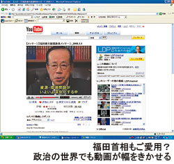 政治の世界でも利用が始まった。民主党の鈴木寛・参院議員がインターネット上の仮想空間「セカンドライフ」でバーチャルな政策講演会を開いたのは広く知られているが、自民党は昨年12月にユーチューブに専用サイト「LDPチャンネル」を開設した。年明けには福田総裁が登場したほか、「河野タローと国会に行こう!」「新テロ特措法の成立にご理解を」などが掲載されている。