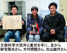 昨年秋に開かれた第18回大会競技部門には、木村照隆さん(制御情報工学科5年生)、新宅雅夫さん(電気工学科5年生)、杉山雄作さん(制御情報工学科2年生)の3人が出場。敗者復活戦から勝ち上がって優勝し文部科学大臣賞を授与された。主に木村さんがプログラムを書き、新宅さんがいじり回して注文を付け、杉山さんは部員を集めて後述する「入札」の練習を繰り返した。
