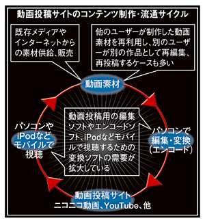 テレビ番組の録画やDVD制作に関連するソフト市場は飽和状態にあるなか、「動画素材→パソコンで編集→動画投稿サイト→パソコン・モバイルで視聴する」という新たな流れが生まれた。配信後は別のユーザーによって再編集され、再び投稿されることもある。ソフトベンダー幹部からは、動画コンテンツの制作や編集を巡る「潮目が変わりつつある」という声も聞かれる。ニューメディアとして急成長する動画投稿サイトの波及効果は、動画編集ソフト業界にも影響を与える。(おわり)(安藤章司●取材/文)