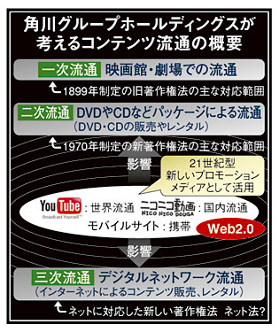 それは、動画投稿サイトを「21世紀型の新しいプロモーションメディア」と角川グループでは捉えているからだ。グローバル規模のプロモーションではYouTube、国内向けではニコニコ動画をメインに位置づける。これに携帯電話などモバイル系のプロモーションチャネルを想定。さらにその先には、インターネットによるコンテンツ販売やレンタルを行う次世代の「デジタルネットワーク流通」を見据える。
