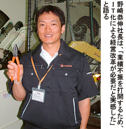 大阪府東大阪市に本社を構えるペンチ・ニッパ製造のフジ矢。1923年創業の老舗企業で、国内市場で業界トップメーカーの地位にある。創業以来、“品質第一”の精神で製品を作ってきたことが名を轟かせている所以だ。その同社がIT化を含めた経営革新で一段と飛躍を遂げている。導入したITシステムは生産管理である。販売予測データをもとに見込生産が行える仕組みだ。営業担当者が作成する販売予測データに基づき、どの製品をどのタイミングで製造するかという指示書が現場に届く。同社は、約550アイテムを扱っている。アイテム数が多いだけに、まとめて作るとなると過剰在庫が発生する危険性がある。生産管理システムを導入したのは2002年10月。6年目を迎えた現段階で、導入前と比べて約40%の在庫圧縮が実現できている。野崎恭伸社長は、「コスト削減だけでなく、売り上げも順調に伸びている」と自信をみせる。導入前に6億円程度だった売上高は、今では10億円にまで達している。