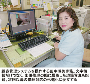 DBは、顧客の氏名や住所などの基本情報とともに、設置状況をデジカメで撮った写真も保存している。これにより、次回、同じ箇所で問題が起きたときに、顧客先まで出向かなくても交換部品の特定が可能になる。1度修理すれば、そうそう壊れるものではなく、修理に関してはなかなか効果が見えてこない側面があった。だが、ここへきて過去に修理経験がある顧客への対応で“写真つきDB”の活用頻度が上昇。DBに基づく迅速な修理で顧客満足度を大幅に高めている。