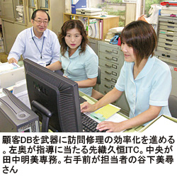 今、水回りの事業環境は大きく変わろうとしている。灯油を使う給湯用ボイラーが多い福井だが、ここ4-5年はオール電化がじわり浸透。これに原油高が加わり、ソーラー式給湯など非灯油系機器の普及を後押しする。もともと灯油ボイラーの修理を得意としてきたタナカ工業だが、顧客ニーズの変化への対応は避けられない。補修部品の品揃え強化や顧客DBの拡充に力を入れる。田中明美専務は、「IT化していなかったら、給湯設備の多様化に対応できなかったかもしれない」と、胸をなでおろす。システム導入で環境変化への適応力がついたというわけだ。