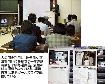 講師はプロが務めるわけではない。塩田支配人の知人や友人、なかには宿泊客にお願いすることもある。テーマもさまざまで経済や金融、娯楽、教育、ITなど。すでに約140回も開催している。講演会スケジュールや過去の内容をホームページやメルマガ、ブログ、SNSとあらゆる情報発信ツールで紹介し、聴講者を募っているのだ。講演会は有料制だが、毎回20-30人ほどが参加し、多い時には50人程度が集まる。