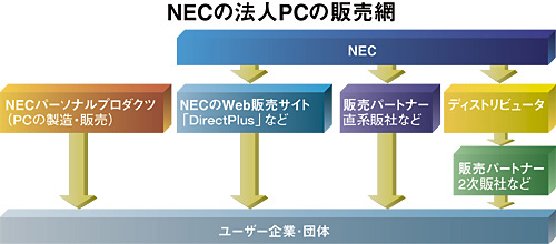 NECの販売ルートは(1)販売パートナー(2)ディストリビュータ(3)NECの営業担当者による直販(4)NECのWebサイト「Direct Plus」などからの直販――の4ルート。ディストリビュータの下には、2次系販社がぶら下がる構図だ。同社から直接製品を調達する販売パートナーとディストリビュータは約370社。(3)のルートを経由するのは一部の大手企業で、(4)は全体の2-3%に過ぎない。Web直販は数年前、デルの攻勢で一世を風靡したが、「現在は市場自体が縮小傾向。NECは販売パートナーを重視しているので、(Web直販に)積極的ではなく広告塔としての意味で展開している」(NECビジネスPC事業部)。つまり、大半のPCは(1)(2)のルートを経由してユーザーに流れる。販売パートナーとの強力な“エコシステム”が生命線というわけだ。
