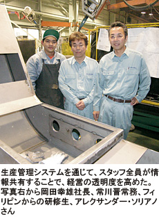 板金加工のコンチネンタル(富山市、岡田幸雄社長)は、生産管理システムを社員全員で活用することで生産効率を高めている。生産管理システムは、工場の管理部門や経営者層のマネジメント用に活用されることが多い。コンチネンタルでは、同システムを生産現場のスタッフと共有し、作業工程の改善や製造にかかる時間の短縮、品質の向上に役立てた。システムの開発元で板金加工メーカーのアマダも「全社で活用しているのは、極めて珍しいケース」と絶賛する。全社活用のベースとなったのが、ITコーディネータ(ITC)の経営指導である。2002年、富山県や中小企業基盤整備機構などが出資する産業振興・情報化推進団体の富山県総合情報センターで行われた経営者研修会に参加したことが、ITCと出会うきっかけとなった。ITを活用した経営革新のコンサルタントを担うことになった宇田川静夫ITCは、さっそく同社の「経営戦略の策定支援」に乗り出す。経営戦略をバランススコアカード(BSC)にまとめ、そのうえで生産管理システムなどのITを活用。BSCで定めた経営指標に沿って行動する仕組みをつくった。