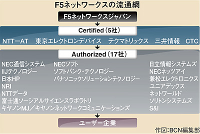 国内L4-7スイッチ市場でトップメーカーの位置にあるF5ネットワークスジャパン(長崎忠雄社長)は、SIとNIの両方が行えるインテグレータを販売代理店として確保している。これにより、コンピュータシステム関連とネットワークインフラ関連のさまざまな方面から製品・サービスを提供できることを強みとしている。1次店として獲得しているのは5社で、ディストリビュータを中心としている。「Certifiedパートナー」と位置づけ、1社あたり1営業担当者を配置。2次店への提案をはじめとした共同マーケティングを行っている。2次店に対する支援制度である「Authorizedパートナー」には17社のインテグレータが参加。1次店を支援することに加え、2次店に対する情報提供やトレーニングなどを強化することでユーザー企業の増加に力を注いでいる。