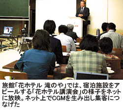 また、福島県の山奥、会津柳津町のひなびた温泉地にある旅館「花ホテル 滝のや」は、いまでは当たり前の自社ホームページにインターネット予約機能を開設して宿泊客を取り込むほか、有力コンテンツとして「女将ブログ」やSNSの「Web2.0」的な展開を行い、お客の気を引いた。その結果、現在では予約客の70%をホームページ経由で獲得するまでになっている。