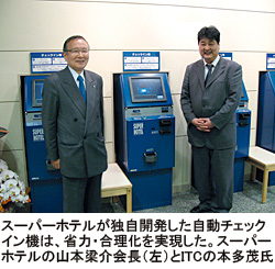 「ITと感動のホテル革命」――。全国89店舗を展開する宿泊特化型ホテルチェーン「スーパーホテル」は1989年の創業以来、このテーゼを掲げ、ITを徹底的に駆使して省力・合理化を追求してきた。その結果、1泊朝食付きで4980円からという低料金を実現している。黄色の地に青文字で「スーパーホテル」と記された看板を知る人は多いだろう。ビジネスホテル業界では後発だが、今年3月のオリコン・リサーチの顧客満足度ランキングで堂々1位に輝いた。「安かろう、悪かろう」のホテルが散見されるなか、「安くて快適な宿泊」を提供して躍進を続けているのだ。創業者である山本梁介会長は、独身者向け賃貸マンションを管理運営する会社を経営する。そこですでに「ITで効率化する術や有効性を理解していた」(山本会長)と話す。「スーパーホテル」開業時には「ITビジネスモデル特許」である自動チェックイン機「ノーキー・ノーチェクアウト」システムを創案し導入。宿泊客はフロント脇に置かれた自動チェックイン機で宿泊料金を支払う。すると、部屋番号と暗証番号を記した領収書が出力される。入室時には、ここに記された番号をドアノブの端末に入力すると開鍵、部屋へ入ることができる仕組みだ。