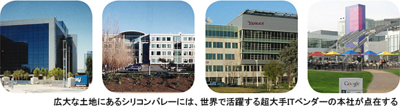 さらに車を走らせるとグーグルのあるマウンテンビュー市、クパティーノ市にはアップル、サニーベール市にはヤフーとAMD、サンタクララ市にはインテルやサン・マイクロシステムズ、最後のサンノゼ市にはシスコシステムズとアドビシステムズなどがある。
