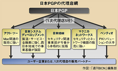 暗号化製品・ソリューション大手の米PGPは、PCのHDDやメールを暗号化するソフト・ソリューションの開発・販売事業を世界178か国で展開。暗号技術専業のソフトメーカーである。顧客数は11万企業・団体以上。その日本法人である日本PGP(北原真之代表取締役)は、2005年に設立された。歴史は浅いが、三井住友銀行や東京大学など有名企業・団体への納入実績があり、販売・流通網はすでに確立されている。日本PGP製品の流通経路はそのほとんどが間接販売で、1次代理店を通じてユーザー企業や2次販社に届く。1次代理店の顔ぶれは、(1)アクト・ツー(2)日本IBM(3)日本システムディベロップメント(NSD)(4)マクニカネットワークス(マクニカ)(5)ペンティオの5社となっている。