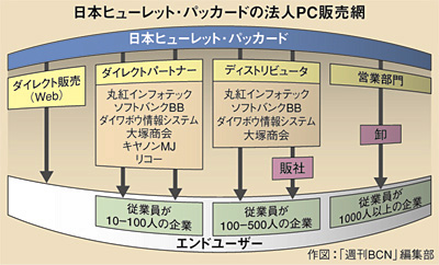 日本ヒューレット・パッカード(日本HP)は、法人向けPCについては「ダイレクト販売(Web)」「ダイレクトパートナー」「ディストリビュータ」「自社営業部門」の販路を通じて販売する。主力はA4ノートPCだ。デスクトップは、NEC、富士通、デルとの競争が続いている。4種のチャネルのうち「ダイレクトパートナー」は、パートナーがHPからPCを購入してカスタマイズのうえ、顧客に販売する制度。丸紅インフォテックやソフトバンクBB、ダイワボウ情報システム、大塚商会、キヤノンMJ、リコーが参加する。ディストリビュータのみの販路ではカスタマイズを行わない標準的な機種を販売している。
