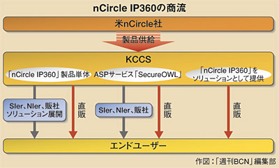 京セラコミュニケーションシステム(KCCS、小林元夫社長)は米国ベンダー、nCircle社のぜい弱性・リスク管理製品「nCircle IP360」を2002年7月から販売している。KCCSはnCircle社の国内総代理店として大手企業などへの導入実績がある。大手SIerやNIerと組んで公共機関にも導入してきた。一方、08年2月より「SecureOWL」ブランドで「nCircle IP360」を使用したぜい弱性検出やレポーティングサービスを提供。また「nCircle IP360」をエンジンとして、顧客仕様の「ソリューション」で提供することもある。商流としては製品、ソリューション、サービスの三つが大きな柱だ。