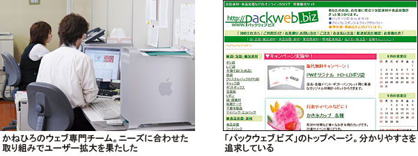 もともと、かねひろはデザインを重視した包装資材を提供する卸業者として注目を集めている。営業担当者が顧客企業の声を反映し、オリジナル商材を開発してもらうためにメーカーと密接に打ち合わせをしている活動が成果となって現れているのだ。物流面では、自社店舗の「パッケージプラザ」と大手メーカーとのアライアンスにより、全国配送の体制を構築。さらに、販売面ではウェブサイトの「パックウェブ.ビズ」で全国網で顧客を獲得した。ウェブサイトは自社で運営しており、新規顧客を開拓できるようにデザインや商材に工夫を凝らしている。「営業」「店舗」「ウェブ」の三本柱が整備された現在、「すべての顧客データを一貫して管理することが事業拡大のポイントになる」(土田社長)と構想している。このような考えから、全社的にシステム連携を図っているのだ。