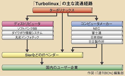 一方、販売・流通は、まず日本ではソフトバンクBBやダイワボウ情報システム、丸紅インフォテックなどの有力ディストリビュータ経由で、サーバーメーカーやSIerが調達し、ユーザー企業に販売するという一般的な仕組みを敷く。サーバーメーカーでは、日立や富士通、日本IBM、NECが名を連ね、自社のハードに「Turbolinux」を組み込んで商品化し、ユーザー企業やSIerに販売するのがメインの流通経路だ。ユニークな分野では、三洋電機にOEM供給しており、三洋は医療システムに同社製品を活用して販売している。