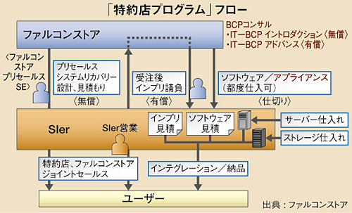 「特約店プログラム」を立ち上げた背景には、「メーカーからユーザーへという商流に変化が起きている。エンドユーザーが主導で独自に情報収集をし、取引先のSIerを通じて仕入れることが多くなっているという事情がある」と山中社長は説明する。エンドユーザーから製品導入の要請があった場合、SIerやリセラーはファルコンストアのプリセールスSEや営業担当者を利用してシステムリカバリの設計、見積り算出やBCPコンサルティングをユーザーに無償/有償で紹介できる。CDPソフトの実装をファルコンストアが請け負う。